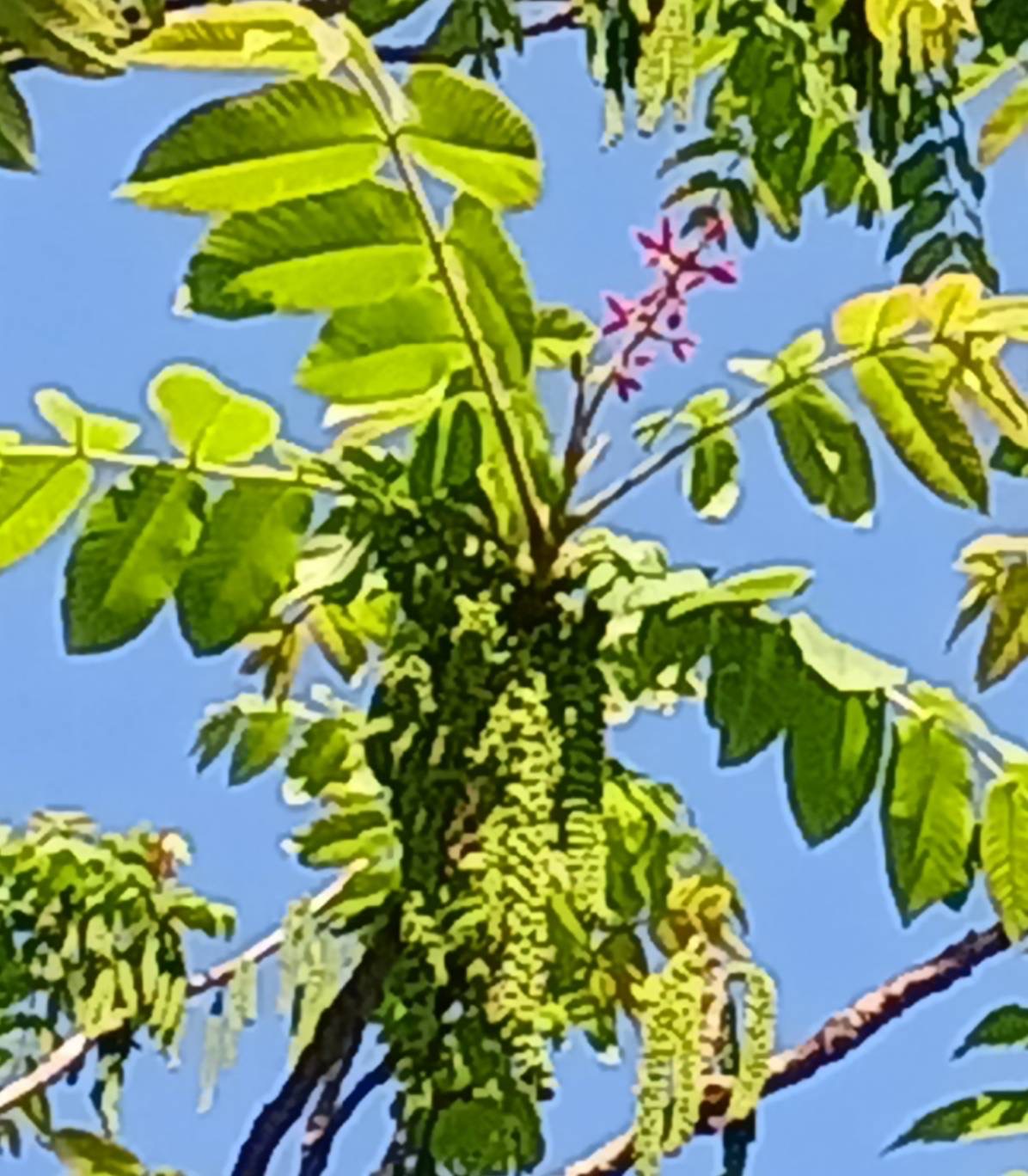 たぬきの庭 最新情報 5/4 オープンガーデン2023(過去の情報) 2023.05.04 クルミの花が咲いています。上の紅色のが雌花、下の房状のが雄花です。(写真で確認できない方は見にお越しください)