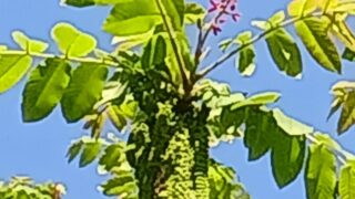 クルミの花が咲いています。上の紅色のが雌花、下の房状のが雄花です。(写真で確認できない方は見にお越しください)